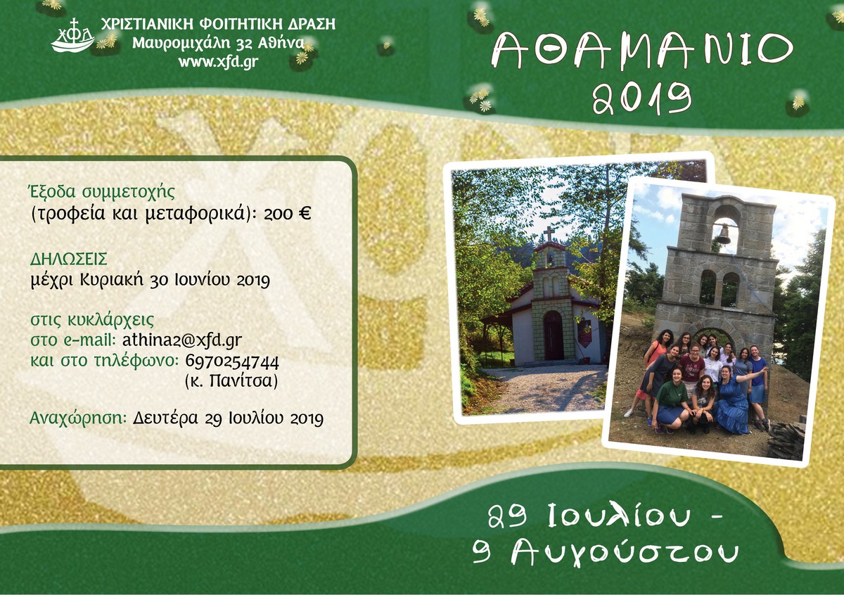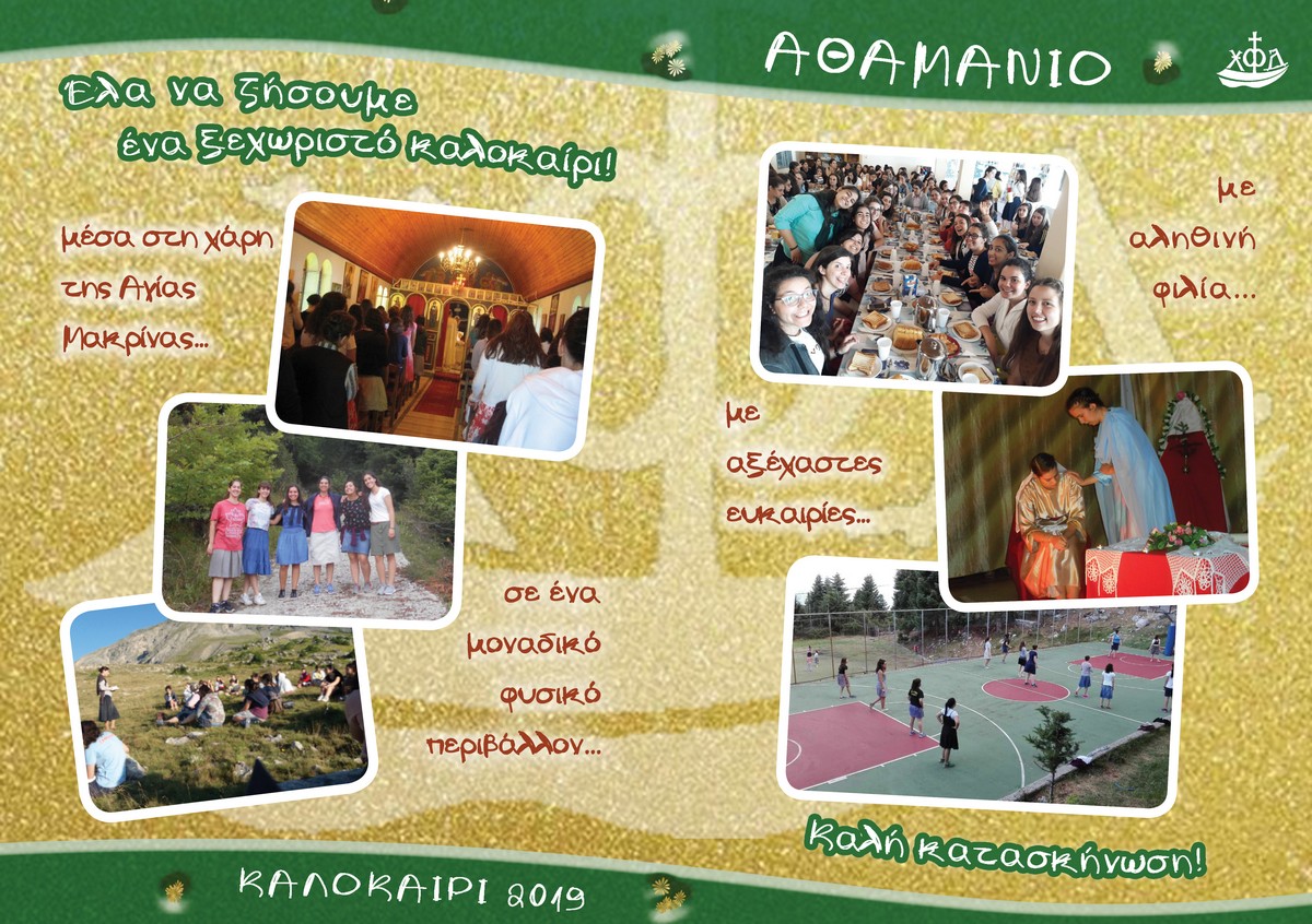 ΑνακοινώσειςΑθήνα Αθαμάνιο 2019 Από φοιτήτριες - Αθήνα - 15 Ιουνίου 2019 0 1848 Εκτύπωση (καμία αξιολόγηση προς το παρόν) Loading... Έλα να ζήσουμε ένα ξεχωριστό καλοκαίρι! Μέσα στη Χάρη της Αγίας Μακρίνας… Σε ένα μοναδικό φυσικό περιβάλλον… Με αληθινή φιλία… Με αξέχαστες ευκαιρίες… Με τον Θεό να μιλά μυστικά στις καρδιές μας! Κατασκήνωση φοιτητριών στο ΑΘΑΜΑΝΙΟ ΑΡΤΑΣ 29 ΙΟΥΛΙΟΥ – 9 ΑΥΓΟΥΣΤΟΥ 2019