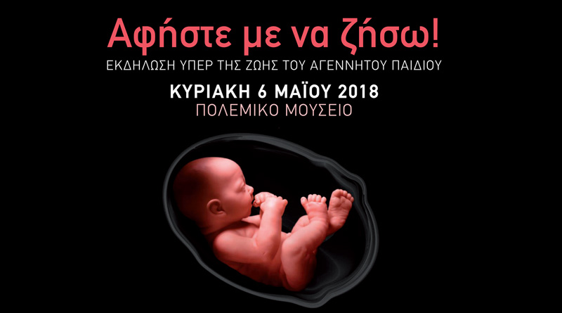 Το νέο κίνημα «Αφήστε με να ζήσω!», το οποίο εδώ και καιρό έχει αγκαλιαστεί από Φορείς, Σωματεία και γενικότερα απ’ όσους σέβονται το θαύμα της ζωής του εμβρύου, από τη σύλληψή του, οργανώνει Ημερίδα, με θέμα την προστασία του αγέννητου παιδιού.