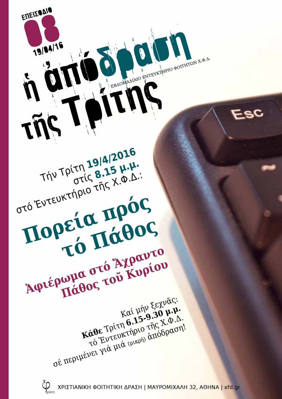 Αυτή την Τρίτη 19-4-2016 στο Εντευκτήριο της ΧΦΔ Αθηνών, αφιέρωμα στο άχραντο πάθος του Κυρίου.