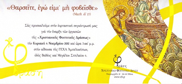 Σας προσκαλούμε στην εορταστική συγκέντρωσή μας για την έναρξη των εργασιών της «Χριστιανικής Φοιτητικής Δράσεως»  την Κυριακή 4 Νοεμβρίου 2012 και ώρα 7.00 μ.μ. στην αίθουσα της ΓΕΧΑ Αμπελοκήπων, οδός Βαθέος και Μεγάλου Σπηλαίου 4.