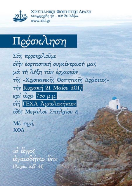 Σας προσκαλούμε στην εορταστική συγκέντρωσή μας για τη λήξη των εργασιών της “Χριστιανικής Φοιτητικής Δράσεως” την Κυριακή 21 Μαΐου 2017 και ώρα 7.00 μ.μ. στην αίθουσα της ΓΕΧΑ Αμπελοκήπων, Μεγάλου Σπηλαίου 4.