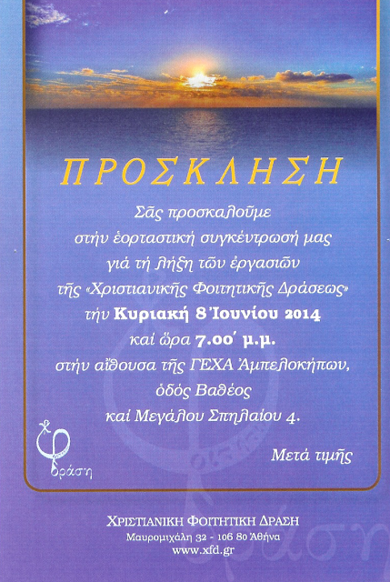 Σας προσκαλούμε στην εορταστική συγκέντρωσή μας για τη λήξη των εργασιών της “Χριστιανικής Φοιτητικής Δράσεως” την Κυριακή 8 Ιουνίου 2014 και ώρα 7.00 μ.μ. στην αίθουσα της ΓΕΧΑ Αμπελοκήπων, Βαθέος και Μεγάλου Σπηλαίου 4.
