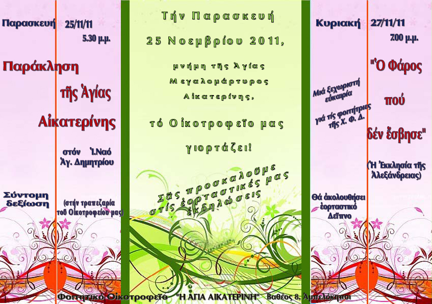 Την Παρασκευή 25 Νοεμβρίου 2011, μνήμη της Αγίας Μεγαλομάρτυρος Αικατερίνης, το Οικοτροφείο μας γιορτάζει και είμαστε όλες προσκεκλημένες στις εορταστικές μας εκδηλώσεις!