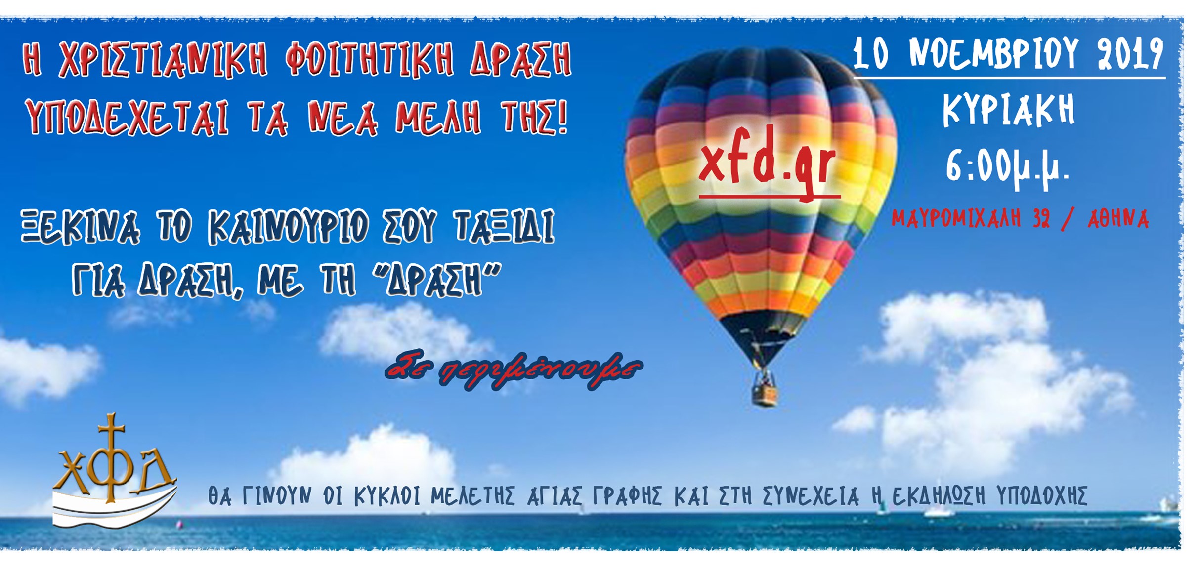 Στο καινούργιο σου ξεκίνημα, στο όμορφο ταξίδι της φοιτητικής σου ζωής, σε καλούμε να ζήσεις στιγμές “δράσης” μαζί μας. Την Κυριακή 10 Νοεμβρίου 2019 και ώρα 6.00 μ.μ. στο εντευκτήριο μας θα γίνουν οι κύκλοι μελέτης Αγίας Γραφής και στη συνέχεια η εκδήλωση υποδοχής πρωτοετών και νέων μελών όπου θα έχεις τη ευκαιρία να γνωρίσεις τους τομείς της Χριστιανικής Φοιτητικής Δράσης μας!