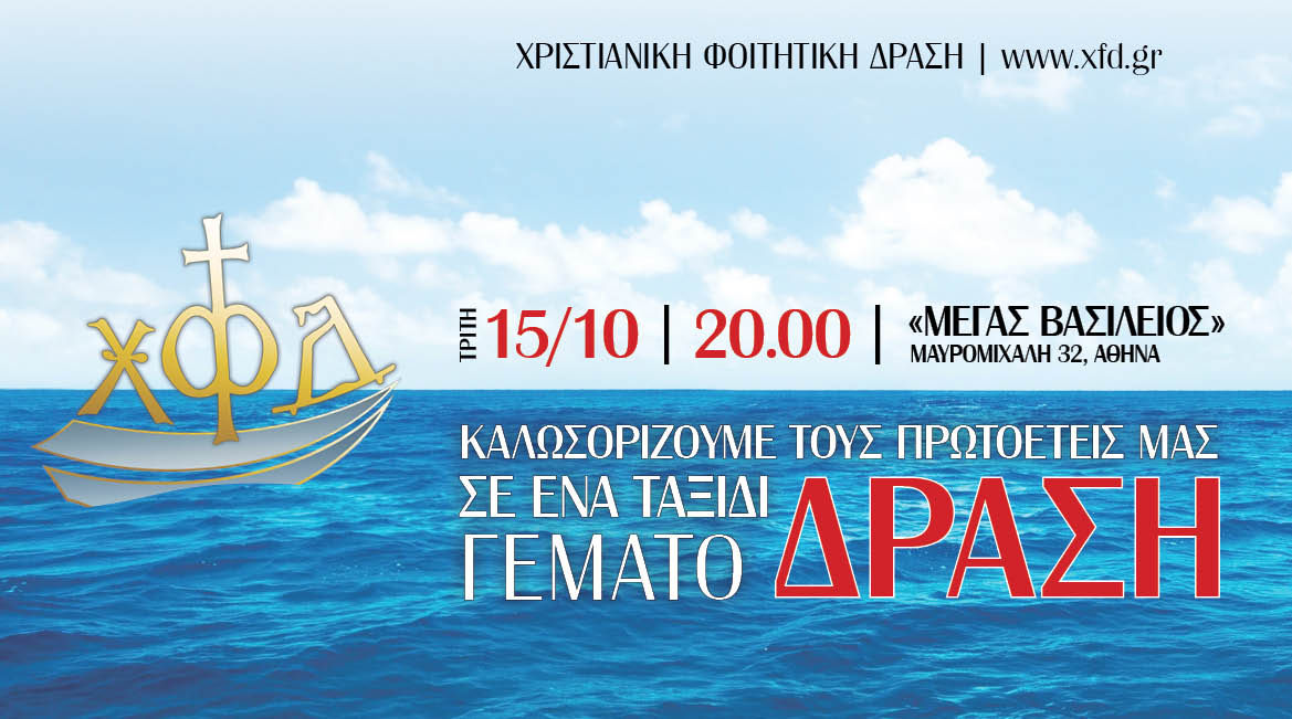 Η οικογένεια της «Χριστιανικής Φοιτητικής Δράσης» Αθηνών σε προσκαλούμε την Τρίτη 15 Οκτωβρίου, στις 8 μ.μ. στο εντευκτήριό μας στον Σύλλογο «Ο Μέγας Βασίλειος», για να σε γνωρίσουμε και να μας γνωρίσεις, και να ξεκινήσουμε μαζί το γεμάτο Δράση ταξίδι μας στα όμορφα φοιτητικά χρόνια. Ένα ταξίδι με οδηγό τον Χριστό και συνταξιδιώτες αληθινούς φίλους, μέσα στον πεντακάθαρο αέρα της Ορθόδοξης Παράδοσης.