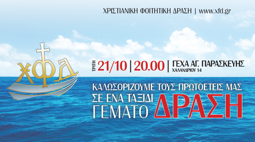 Η οικογένεια της «Χριστιανικής Φοιτητικής Δράσης» Αθηνών σε προσκαλούμε την Τρίτη 21 Οκτωβρίου, στις 8.00 μ.μ. στη ΓΕΧΑ Αγίας Παρασκευής (Χαλανδρίου 14) για να σε γνωρίσουμε και να μας γνωρίσεις, και να ξεκινήσουμε μαζί το γεμάτο Δράση ταξίδι μας στα όμορφα φοιτητικά χρόνια. Ένα ταξίδι με οδηγό τον Χριστό και συνταξιδιώτες αληθινούς φίλους, μέσα στον πεντακάθαρο αέρα της Ορθόδοξης Παράδοσης.