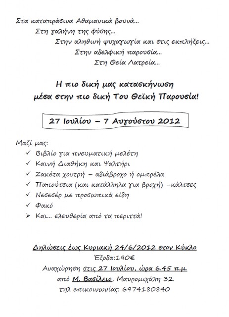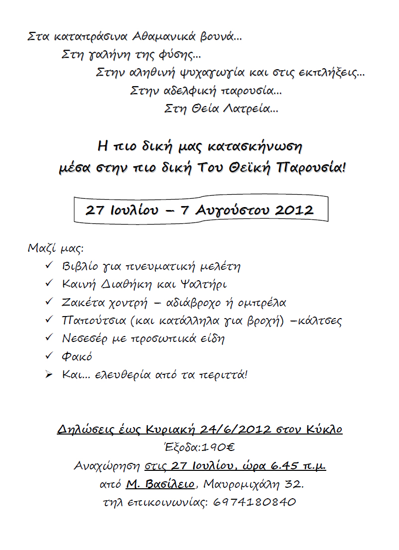 Αναχώρηση στις 27 Ιουλίου, ώρα 6:45π.μ. από Μ.Βασίλειο, Μαυρομιχάλη 32.