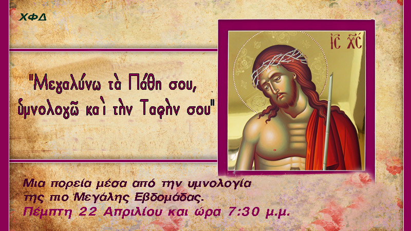 ΑνακοινώσειςΑθήνα Μεγαλύνω τὰ Πάθη Σου, ὑμνολογῶ καὶ τὴν Ταφὴν Σου Από φοιτήτριες - Αθήνα - 20 Απριλίου 2021 0 840 Εκτύπωση (3 ψήφοι, μέσος όρος: 5,00 από 5) Loading... Μια ευκαιρία και προετοιμασία για την Μ. Εβδομάδα. Μια πορεία με πολλά μηνύματα μέσα από τους εξαίρετους ύμνους της Εκκλησίας μας. Πέμπτη 22 Απριλίου 2021 και ώρα 7:30 μ.μ.
