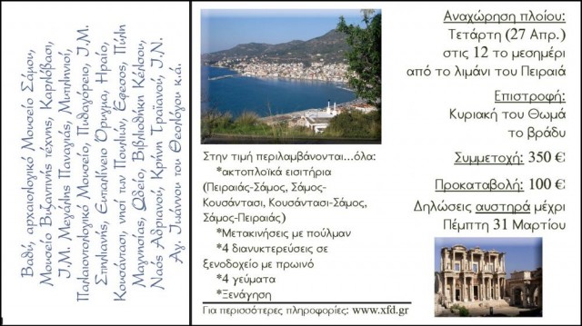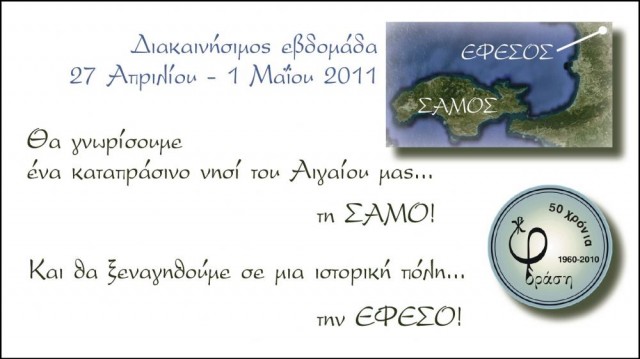 Η φετινή πολυήμερη προσκυνηματική εκδρομή των φοιτητών της Χριστιανικής Φοιτητικής Δράσης Αθηνών θα πραγματοποιηθεί στο νησί της Σάμου, κατά τη Διακαινήσιμο Εβδομάδα, ενώ μία ολόκληρη ημέρα θα επισκεφθούμε την Έφεσο.