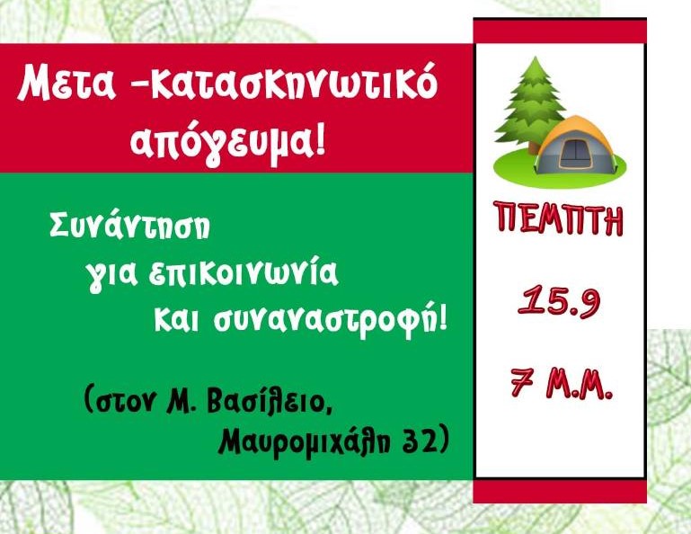Την Πέμπτη 15 Σεπτεμβρίου και ώρα 7.00 μ.μ. σε περιμένουμε στο εντευκτήριό μας για μια συνάντηση μετακατασκηνωτική.