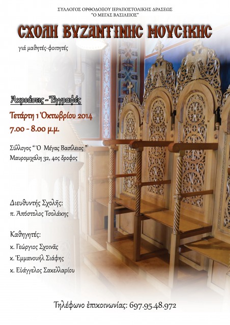 Ακροάσεις και εγγραφές υποψηφίων μαθητών στη Σχολή Βυζαντινής Μουσικής “Ο Μέγας Βασίλειος” θα γίνουν την Τετάρτη 1 Οκτωβρίου 2014 και ώρα 7.00-8.00 μ.μ. στο κτήριο του Συλλόγου “Ο Μέγας Βασίλειος”, Μαυρομιχάλη 32, 4ος όροφος.