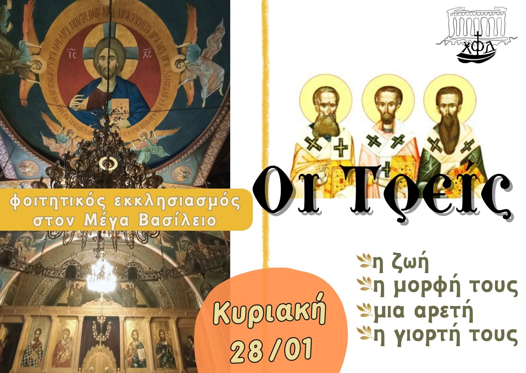 ΑνακοινώσειςΑθήνα την Κυριακή με τη Δράση! Από φοιτήτριες - Αθήνα - 26 Ιανουαρίου 2024 0 459 Εκτύπωση (καμία αξιολόγηση προς το παρόν) Loading... “Οι Τρεις” . … ένα πρωινό αφιέρωμα στο εντευκτήριό μας! Την Κυριακή 28 Ιανουαρίου, μετά τον κοινό φοιτητικό Εκκλησιασμό στον “Μέγα Βασίλειο”. Καλή αντάμωση!