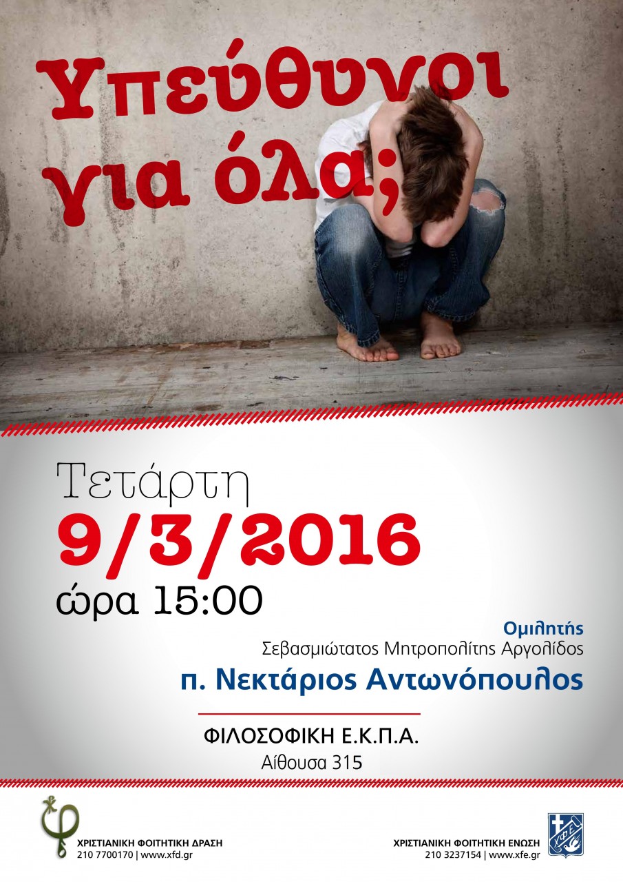 Εξεταστική τελος!(έστω για τους περισσότερους!) Άγχος και πιέση τέλος! Ατελείωτες ώρες διαβάσματος (προς στιγμήν) τέλος! Τώρα είναι η ευκαιρία για Δράση και πνευματικό ανεφοδιασμό. Πάρε το ημερολόγιό σου και κύκλωσε και υπογράμμισε την Τετάρτη 9 Μαρτίου 2016! Στην σχολή της Φιλοσοφικής στις 3:00μμ θα έχουμε την ευκαιρία και την ευλογία να μας μιλήσει και να συζητήσουμε με τον σεβασμιώτατο Μητροπολίτη Αργολίδος π. Νεκτάριο Αντωνόπουλο πάνω στο θέμα με τίτλο ¨Υπεύθυνοι για όλα;¨.