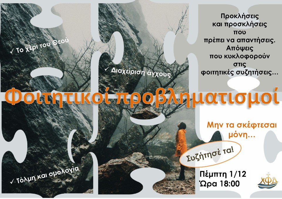 ΑνακοινώσειςΑθήνα Φοιτητικοί προβληματισμοί Από φοιτήτριες - Αθήνα - 28 Νοεμβρίου 2022 0 589 Εκτύπωση (2 ψήφοι, μέσος όρος: 5,00 από 5) Loading... Προκλήσεις και προσκλήσεις… που πρέπει να απαντήσεις. Απόψεις που κυκλοφορούν στις φοιτητικές συζητήσεις… διαχείριση άγχους τόλμη και ομολογία το χέρι του Θεού Μην τα σκέφτεσαι μόνη.. Συζήτησέ τα! Στο εντευκτήριο μας, την Πέμπτη 1/12, ώρα 18:00-20:00, εορταστικές δραστηριότητες και ακολούθως συζήτηση. Σε περιμένουμε!