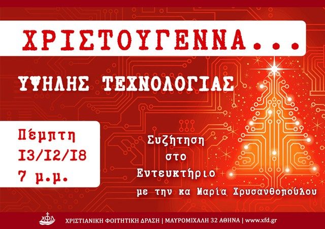ΑνακοινώσειςΑθήνα Χριστούγεννα… υψηλής τεχνολογίας Από φοιτήτριες - Αθήνα - 12 Δεκεμβρίου 2018 0 917 Εκτύπωση (καμία αξιολόγηση προς το παρόν) Loading... Εσύ είσαι έτοιμη για τα φετινά Χριστούγεννα; Είσαι έτοιμη για Χριστούγεννα υψηλής τεχνολογίας; Πέμπτη 13/12/18 7 μ.μ. στο Εντεκτήριό μας