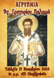 Στις 13 Νοεμβρίου μέρα Τετάρτη, στο οικοτροφείο μας στην Θεσσαλονίκη, στις 10 μ.μ. θα τελεστεί Ιερά Αγρυπνία στη μνήμη του Αγίου Γρηγορίου του Παλαμά.