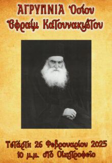Την Τετάρτη 26 Φεβρουαρίου θα τελεστεί ιερά Αγρυπνία στη μνήμη του Οσίου Εφραίμ του Κατουνιακιώτου στις 10 μ.μ. στο οικοτροφείο.