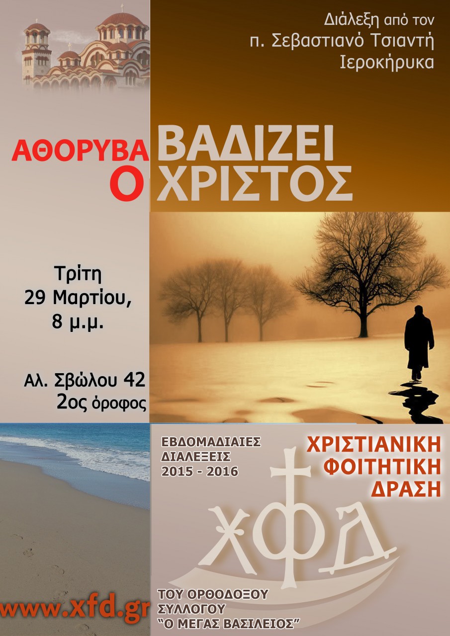 ΑνακοινώσειςΘεσσαλονίκη Διάλεξη με θέμα: Αθόρυβα βαδίζει ο Χριστός Από Θεσσαλονίκη - 26 Μαρτίου 2016 0 803 Εκτύπωση (καμία αξιολόγηση προς το παρόν) Loading... Ομιλητής ο αρχιμ. π. Σεβαστιανός Τσιαντής την Τρίτη 29 Μαρτίου 8 μ.μ.