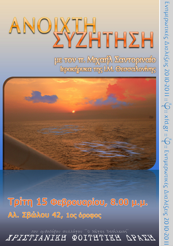 Την Τρίτη 15 Φεβρουαρίου θα πραγματοποιηθεί η δεύτερη ανοιχτή συζήτηση για τους φοιτητές με τον ιεροκήρυκα της Ι.Μ. Θεσσαλονίκης π. Μιχαήλ Σαντοριναίο στην αίθουσα της Αλεξάνδρου Σβώλου 42. Κάποιες από τις ερωτήσεις που διατυπώθηκαν στην πρώτη ανοιχτή συζήτηση είναι οι εξής: