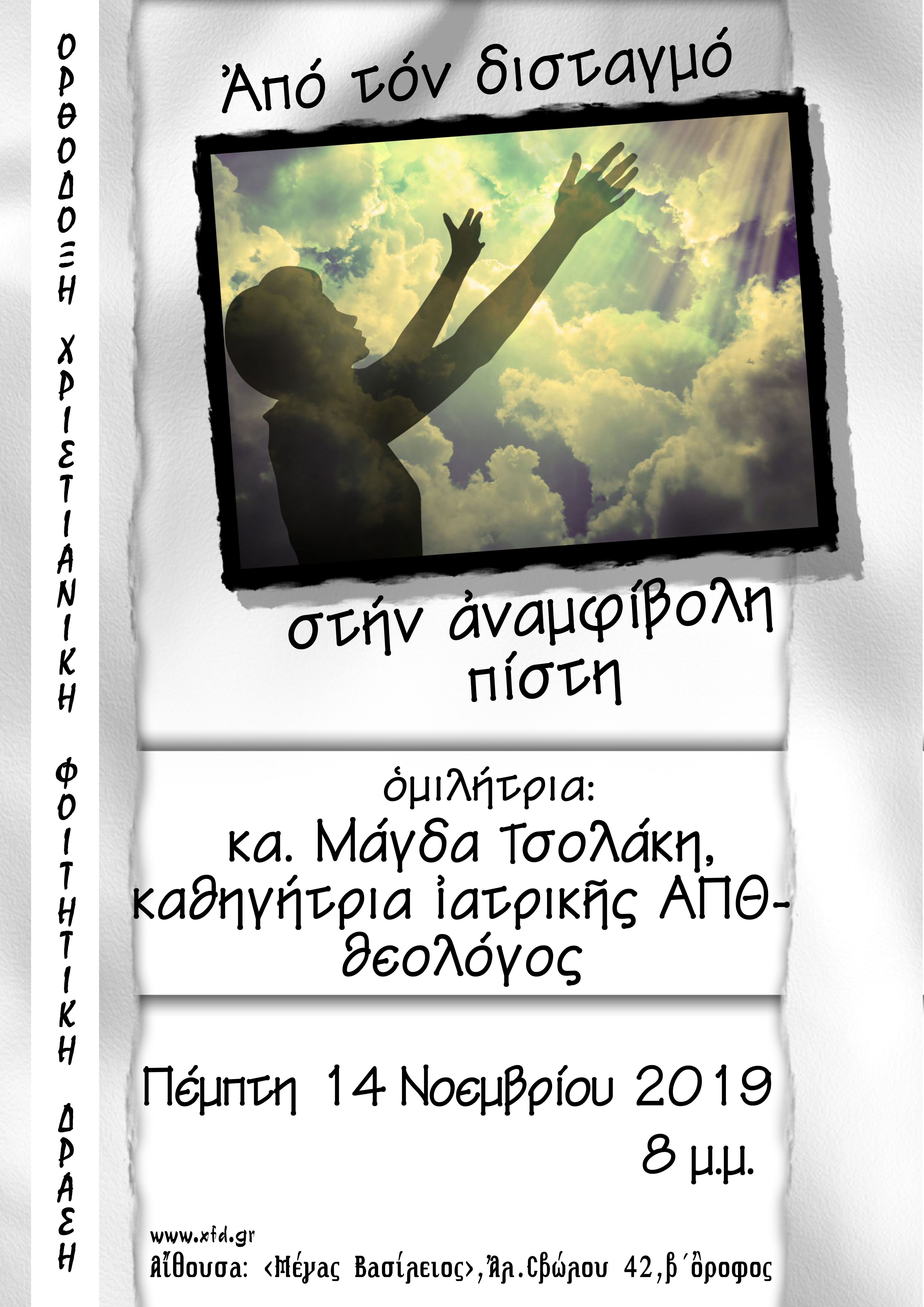 ΑνακοινώσειςΘεσσαλονίκη Από το δισταγμό στην αναμφίβολη πίστη Από φοιτήτριες - Θεσσαλονίκη - 10 Νοεμβρίου 2019 0 755 Εκτύπωση (καμία αξιολόγηση προς το παρόν) Loading... Ομιλία με θέμα “Από τον δισταγμό στην αναμφίβολη πίστη”, από την κα. Μάγδα Τσολάκη, την Πέμπτη 14 Νοεμβρίου στις 8μ.μ., στην Αλεξάνδρου Σβώλου.