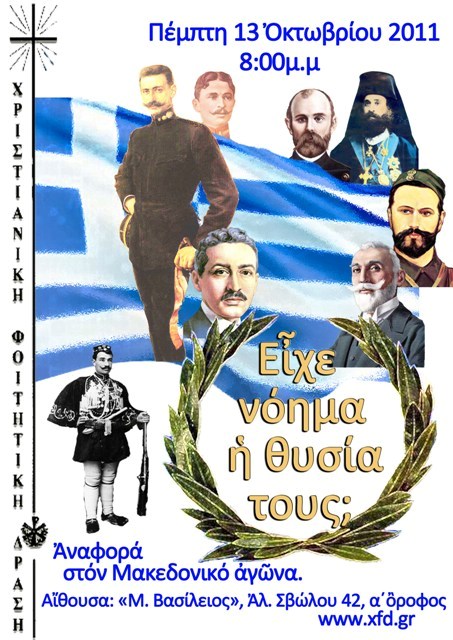ΑνακοινώσειςΘεσσαλονίκη Αφιέρωμα στον Μακεδονικό Αγώνα Από Θεσσαλονίκη - 11 Οκτωβρίου 2011 0 799 Εκτύπωση (καμία αξιολόγηση προς το παρόν) Loading... Την Πέμπτη 13/10 και ώρα 20.00 οι φοιτήτριες της Χριστιανικής Φοιτητικής Δράσης συμμετέχουν στο αφιέρωμα για τον Μακεδονικό αγώνα. Η εκδήλωση θα λάβει χώρα στην αίθουσα “Μ.Βασίλειος”, στην Αλ. Σβώλου 42, στον α΄όροφο.