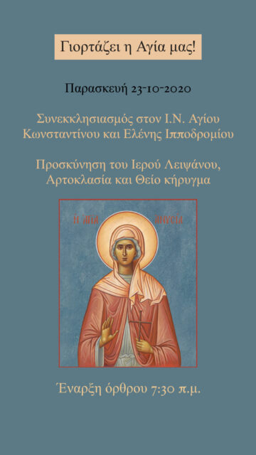 Γιορτή της ανακομιδής του τιμίου λειψάνου της Αγίας Ανυσίας. Την Παρασκευή 23.10.2020, συνεκκλησιασμός στον Ι.Ν. Αγίου Κωνσταντίνου και Ελένης. Προσκύνηση του Ιερού Λειψάνου, Αρτοκλασία και Θείο κήρυγμα.