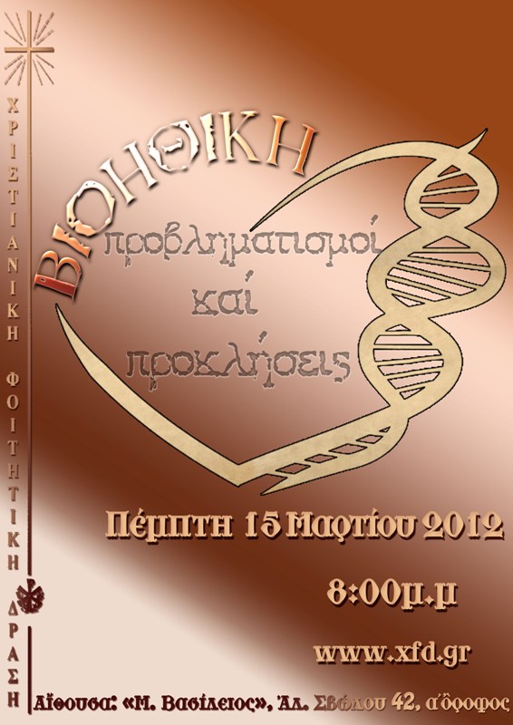 ΑνακοινώσειςΘεσσαλονίκη Διάλεξη με θέμα: Βιοηθική-Προβληματισμοί και Προκλήσεις Από Θεσσαλονίκη - 12 Μαρτίου 2012 0 638 Εκτύπωση (καμία αξιολόγηση προς το παρόν) Loading... Την Πέμπτη 15/3 και ώρα 20.00 θα πραγματοποιηθεί για τις φοιτήτριες διάλεξη με θέμα: Βιοηθική-Προβληματισμοί και Προκλήσεις. Η διάλεξη θα γίνει στην αίθουσα “Μέγας Βασίλειος”, στην Αλ. Σβώλου 42, στον α΄όροφο.