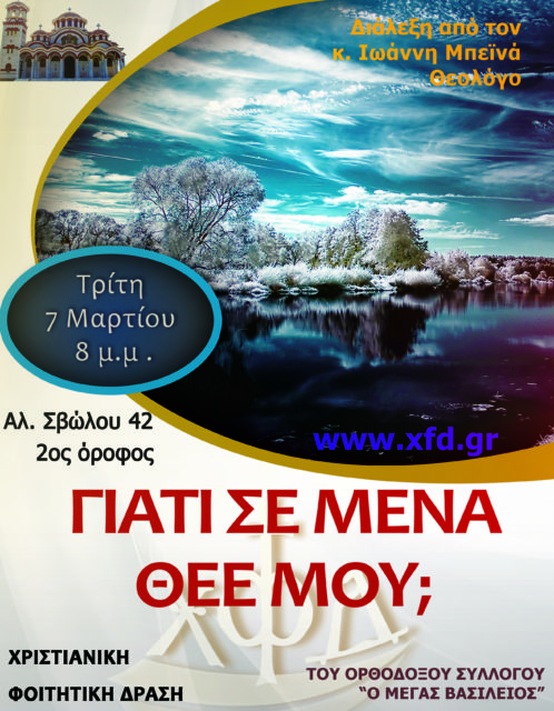 ΑνακοινώσειςΘεσσαλονίκη Διάλεξη με θέμα: «Γιατί σε μένα Θεέ μου;» Από φοιτητές - Θεσσαλονίκη - 4 Μαρτίου 2017 0 879 Εκτύπωση (καμία αξιολόγηση προς το παρόν) Loading... Διάλεξη από τον κ. Ιωάννη Μπεϊνά, Θεολόγο Θέμα: «Γιατί σε μένα Θεέ μου;» Τρίτη 7 Μαρτίου στις 8 μ.μ., Σβώλου 42