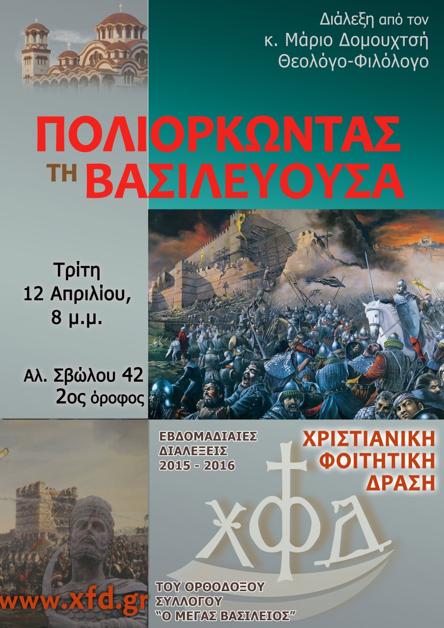 ΑνακοινώσειςΘεσσαλονίκη Διάλεξη με θέμα: «Πολιορκώντας τη Βασιλεύουσα». Από Θεσσαλονίκη - 6 Απριλίου 2016 0 597 Εκτύπωση (καμία αξιολόγηση προς το παρόν) Loading... Ομιλητής ο κ. Μάριος Δομουχτσής Την Τρίτη 12 Απριλίου 8 μ.μ.