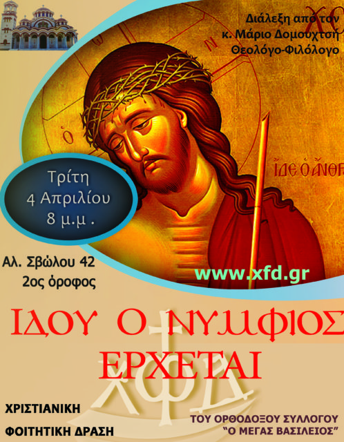 ΑνακοινώσειςΘεσσαλονίκη Διάλεξη με θέμα: «Ἰδού ὁ Νυμφίος ἔρχεται» Από φοιτητές - Θεσσαλονίκη - 2 Απριλίου 2017 0 1013 Εκτύπωση (καμία αξιολόγηση προς το παρόν) Loading... Διάλεξη από τον κ. Μάριο Δομουχτσή, Θεολόγο-Φιλόλογο Θέμα:«Ἰδού ὁ Νυμφίος ἔρχεται» Τρίτη 4 Απριλίου στις 8 μ.μ., Σβώλου 42