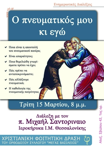 Την Τρίτη 15 Μαρτίου στις 20.00 στην αίθουσά μας, Αλεξ. Σβώλου 42, θα πραγματοποιηθεί διάλεξη από τον Ιεροκήρυκα της Ι.Μ. Θεσσαλονίκης π. Μιχαήλ Σαντοριναίο, με θέμα: