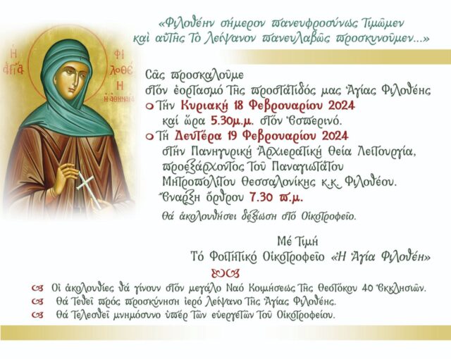ΑνακοινώσειςΘεσσαλονίκη Εορτασμός της προστάτιδας του Οικοτροφείου μας! Από φοιτήτριες - Θεσσαλονίκη - 17 Φεβρουαρίου 2024 0 451 Εκτύπωση (1 ψήφοι, μέσος όρος: 5,00 από 5) Loading... Σας προσκαλούμε στον εορτασμό της προστάτιδος Αγίας μας Φιλοθέης, στο χριστιανικό φοιτητικό οικοτροφείο της Θεσσαλονίκης .