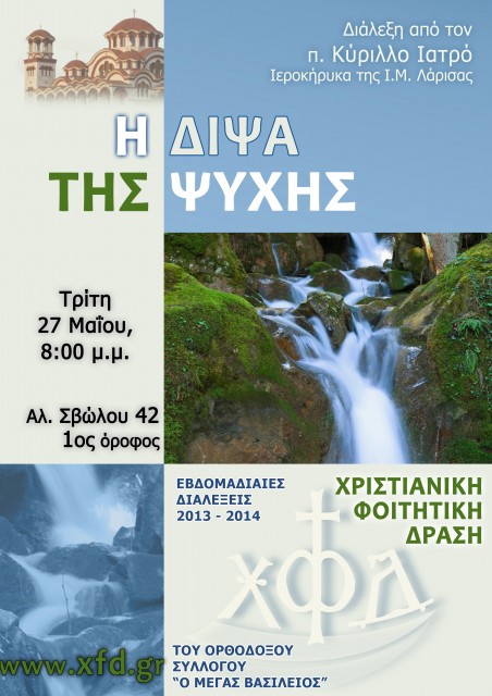 Την Τρίτη 27 Μαΐου  και ώρα 8.00 μ.μ. οι φοιτητές της Χ.Φ.Δ. Θεσσαλονίκης θα έχουμε την ευκαιρία να συμμετάσχουμε στη διάλεξη που θα πραγματοποιηθεί από τον π. Κύριλλο Ιατρό