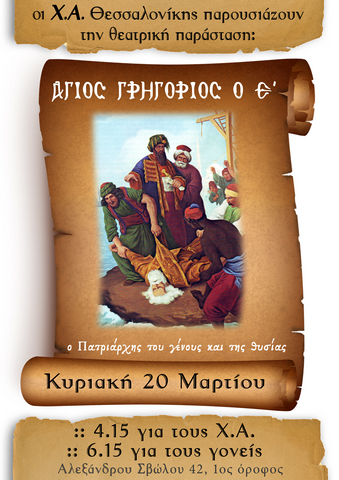 Την Κυριακή 20 Μαρτίου και ώρα 18.15, η Χριστιανική Φοιτητική Δράση και οι Χαρούμενοι Αγωνιστές Θεσσαλονίκης σας προσκαλούν στην εορταστική εκδήλωση που ετοίμασαν για την εθνική εορτή της Παλιγγενεσίας. Στην εκδήλωση θα παρουσιαστεί η θεατρική παράσταση: