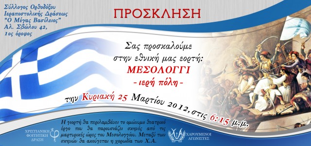 Την Κυριακή 25 Μαρτίου και ώρα 18.00, η Χριστιανική Φοιτητική Δράση και οι Χαρούμενοι Αγωνιστές Θεσσαλονίκης σας προσκαλούν στην εορταστική εκδήλωση που ετοίμασαν για την εθνική εορτή της Παλιγγενεσίας. Στην εκδήλωση θα παρουσιαστεί η θεατρική παράσταση: