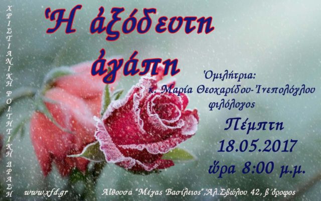 ΑνακοινώσειςΘεσσαλονίκη Ομιλία: Η Αξόδευτη Αγάπη Από φοιτήτριες - Θεσσαλονίκη - 15 Μαΐου 2017 0 1105 Εκτύπωση (καμία αξιολόγηση προς το παρόν) Loading...