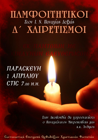 Την Παρασκευή 1 Απριλίου 2011 και ώρα 07.00 μ.μ. η Συντονιστική Επιτροπή Ορθοδόξων Χριστιανών Φοιτητών Θεσσαλονίκης προσκαλεί όλους τους φοιτητές και τις φοιτήτριες να αναπέμψουν ύμνο ευχαριστίας στην Υπεραγία Θεοτόκο κατά την ακολουθία των Δ΄ Χαιρετισμών.
