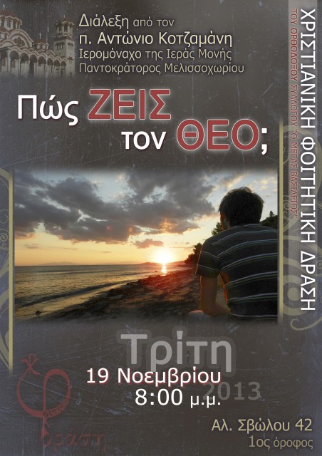Την Τρίτη 19 Νοεμβρίου και ώρα 8.00 μμ. οι φοιτητές της Χ.Φ.Δ. Θεσσαλονίκης θα έχουμε την ευκαιρία να συμμετάσχουμε στη διάλεξη που θα πραγματοποιηθεί από τον π. Αντώνιο Κοτζαμάνη Ιερομόναχο της Ιεράς Μονής Παντοκράτορος Μελισσοχωρίουμε θέμα: