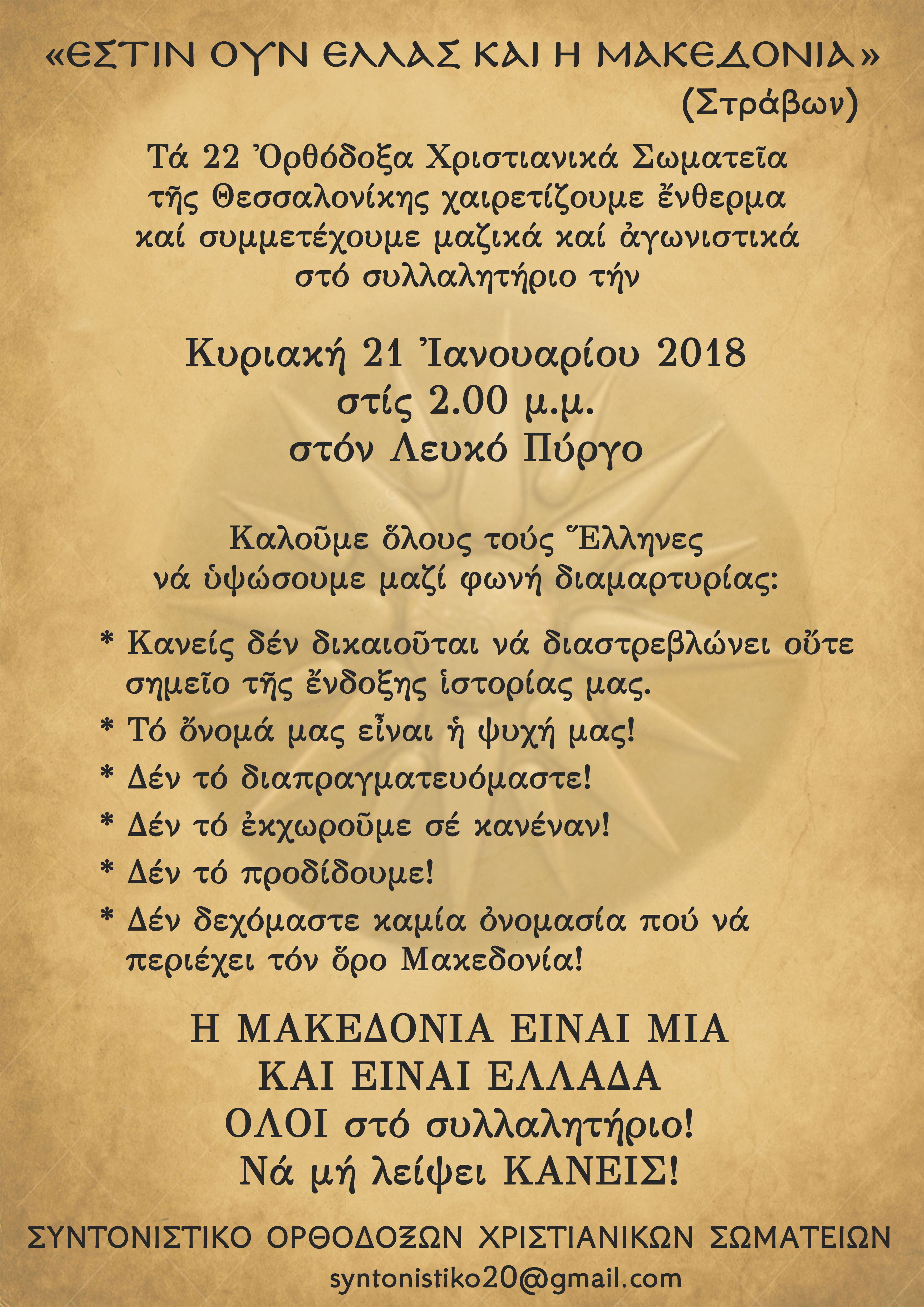 Κάποιοι προσπαθούν αυτή την στιγμή να περάσουν από την πίσω πόρτα ονομασία για τα Σκόπια που να περιλαμβάνει μέσα και τον όρο Μακεδονία. Θα πρέπει να τους υπενθυμίσουμε ότι ΜΑΚΕΔΟΝΙΚΟ ΕΘΝΟΣ ΟΥΤΕ ΥΠΗΡΞΕ ΟΥΤΕ ΥΠΑΡΧΕΙ…