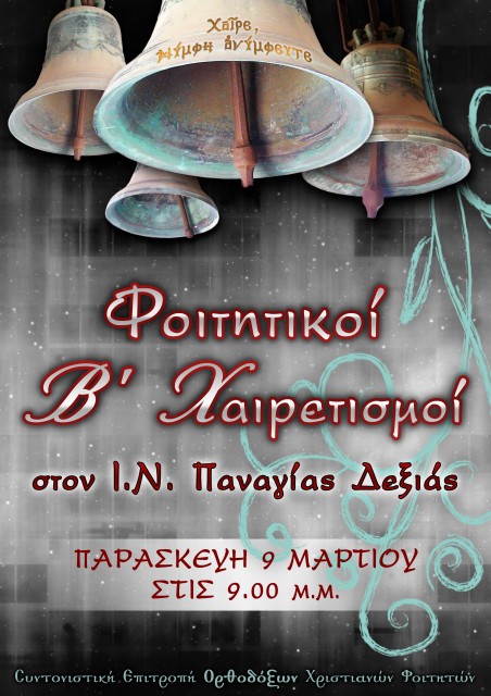 Την Παρασκευή 9 Μαρτίου και ώρα 9.00 μ.μ. η Συντονιστική Επιτροπή Ορθοδόξων Χριστιανών Φοιτητών Θεσσαλονίκης προσκαλεί όλους τους φοιτητές και τις φοιτήτριες να αναπέμψουν ύμνο ευχαριστίας στην Υπεραγία Θεοτόκο κατά την ακολουθία των Β΄ Χαιρετισμών.