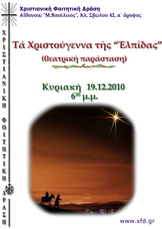 Την Κυριακή 19/12 και ώρα 18.30 οι φοιτήτριες της Χριστιανικής Φοιτητικής Δράσης σας προσκαλούν να παρακολουθήσετε τη θεατρική παράσταση: “Τα Χριστούγεννα της Ελπίδας”. Η χριστουγεννιάτικη γιορτή θα πραγματοποιηθεί στην αίθουσα “Μέγας Βασίλειος”, α’ όροφος, στην Αλεξάνδρου Σβώλου 42.