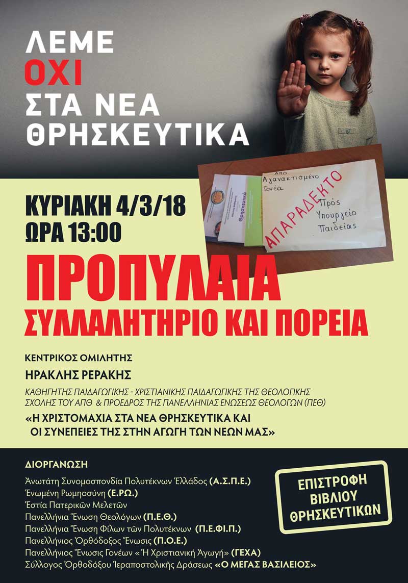 Ενάντια στην έκτακτη αυτή απειλή προς τα παιδιά μας, εκφράζουμε την ανησυχία μας και ενώνουμε τη φωνή μας με όλους τους Έλληνες στη μεγάλη ανοικτή εκδήλωση στα Προπύλαια του Πανεπιστημίου Αθηνών την Κυριακή 4 Μαρτίου 2018 στις 13.00.