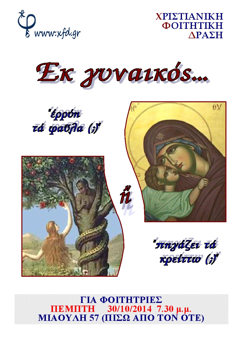 θα έχουμε την ευκαιρία να συζητήσουμε σχετικά με τη γυναίκα και το ρόλο της σήμερα. Έχει μερίδιο ευθύνης για τα ”άσχημα” που βλέπουμε γύρω μας; Έχει συμβάλλει στην επίτευξη των ”καλών” και την πρόοδο;