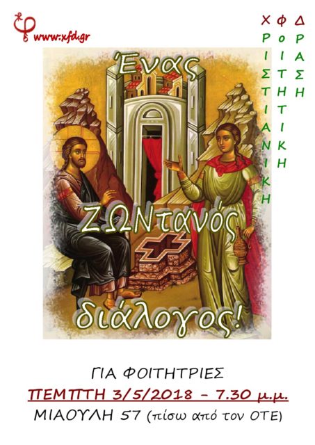 ΑνακοινώσειςΠάτρα ” Ένας ΖΩΝτανός διάλογος! “ Από φοιτήτριες - Πάτρα - 29 Απριλίου 2018 0 856 Εκτύπωση (καμία αξιολόγηση προς το παρόν) Loading... Την Πέμπτη 3 Μαΐου 2018 και ώρα 7.30μ.μ. οι φοιτήτριες της Χ.Φ.Δ. Πατρών θα έχουμε την ευκαιρία να μελετήσουμε έναν ζωντανό διάλογο από το Ευαγγέλιο! Σε περιμένουμε!