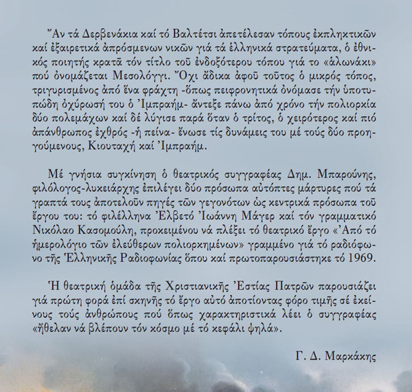 «Από το ημερολόγιο των Ελεύθερων Πολιορκημένων» που θα γίνει την Τετάρτη 25 Μαρτίου 2009 στην αίθουσα της Χριστιανικής Εστίας Πατρών, Κανάρη 58.