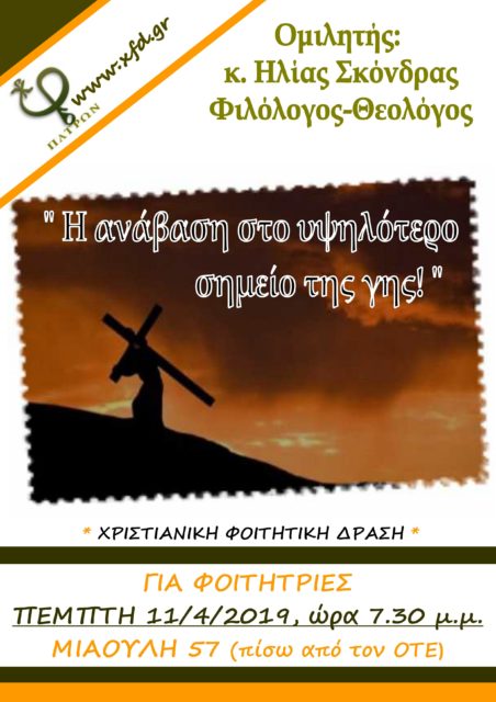 ΑνακοινώσειςΠάτρα ” Η ανάβαση στο υψηλότερο σημείο της γης! “ Από φοιτήτριες - Πάτρα - 8 Απριλίου 2019 0 821 Εκτύπωση (καμία αξιολόγηση προς το παρόν) Loading... Την Πέμπτη 11 Απριλίου 2019 και ώρα 7.30μμ. οι φοιτήτριες της Χριστιανικής Φοιτητικής Δράσεως θα “παρακολουθήσουμε” την ανάβαση στο υψηλότερο σημείο της γης! Αφιέρωμα στη Μεγάλη Εβδομάδα!
