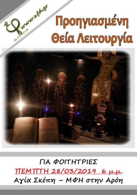 Προηγιασμένη Θεία Λειτουργία στο ναό της Παναγίας μας – Αγία Σκέπη- στη Μονάδα Φροντίδας Ηλικιωμένων της Χριστιανικής Εστίας στην Αρόη Πατρών και επίσκεψη στους παππούδες και τις γιαγιάδες.