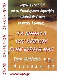Την Τρίτη 12 Μαρτίου 2013 και ώρα 8μμ., θα πραγματοποιηθεί  κοινή συνάντηση φοιτητών και φοιτητριών με ομιλητή τον Πανοσιολογιώτατο Αρχιμανδρίτη π.Χριστόδουλο Κογιώνη.