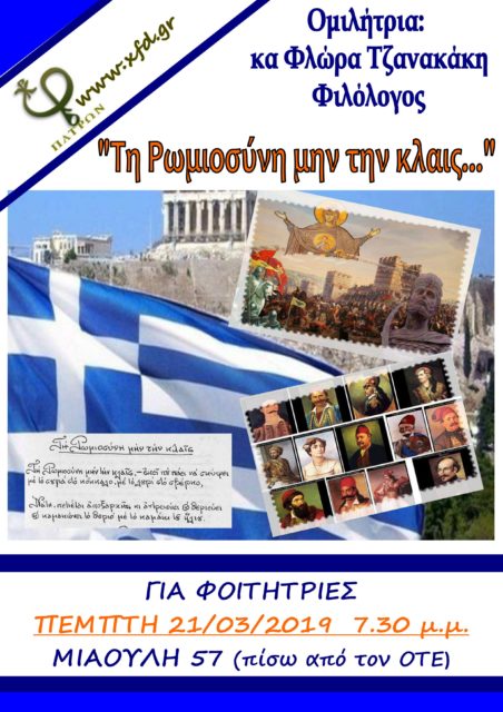 Με αφορμή την επέτειο της 25ης Μαρτίου 1821 οι φοιτήτριες θα αφιερώσουν τη συνάντησή τους στην πληγωμένη αλλά πάντοτε ανδρεία Ρωμιοσύνη! Ομιλήτρια η κα Φλώρα Τζανακάκη, Φιλόλογος.