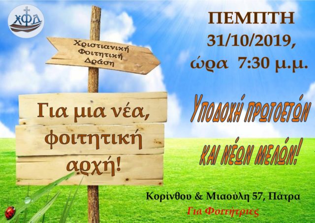 ΑνακοινώσειςΠάτρα Υποδοχή Πρωτοετών και Νέων Μελών! Από φοιτήτριες - Πάτρα - 26 Οκτωβρίου 2019 0 731 Εκτύπωση (καμία αξιολόγηση προς το παρόν) Loading... Η Χριστιανική Φοιτητική Δράση Πατρών υποδέχεται ΠΡΩΤΟΕΤΕΙΣ ΦΟΙΤΗΤΡΙΕΣ και ΝΕΑ ΜΕΛΗ σε μια γιορτή προς τιμήν τους. ΠΕΜΠΤΗ 31 ΟΚΤΩΒΡΙΟΥ 2019, ώρα 7.30 μ.μ. Σε περιμένουμε με χαρά!